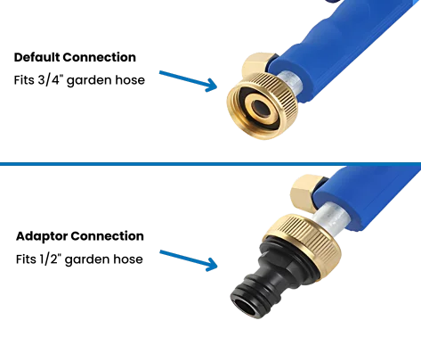 JetHose‘s Default Connection fits 3/4″ garden hoses for standard use, while the included Adaptor Connection fits 1/2″ garden hoses, providing flexibility and convenience for all your cleaning and watering needs.